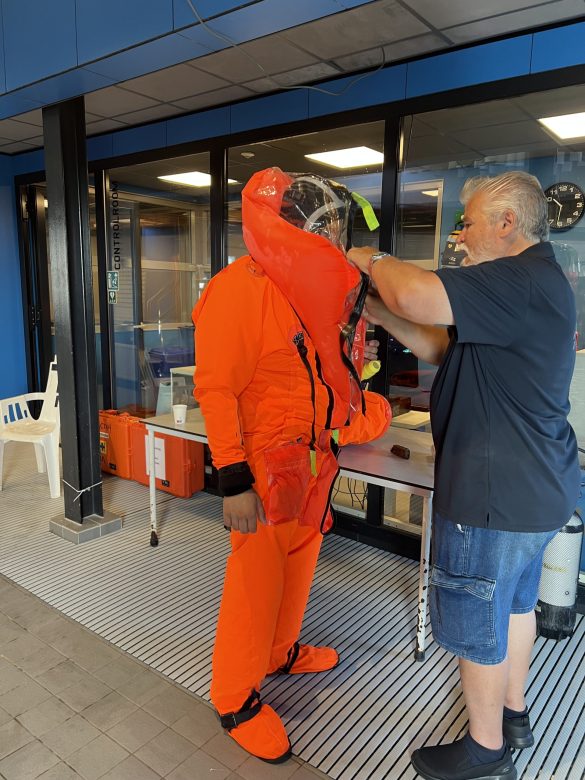 Daarna volgde een sessie in de Single Man Life Raft. Hier leerden de deelnemers hoe zij in een overlevingspak snel en effectief kunnen handelen in noodsituaties op zee. Dit oefenmoment leverde direct bruikbare ervaring op.