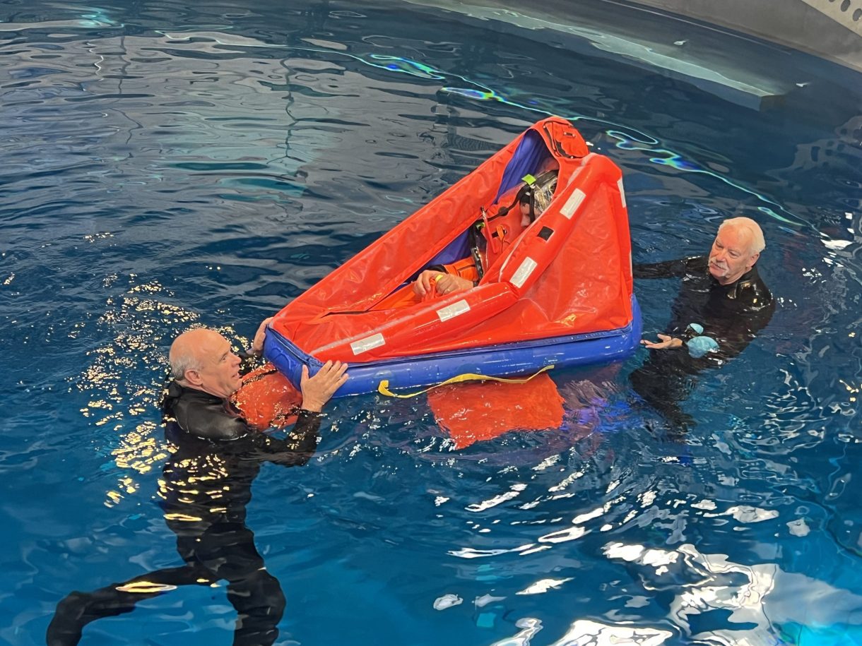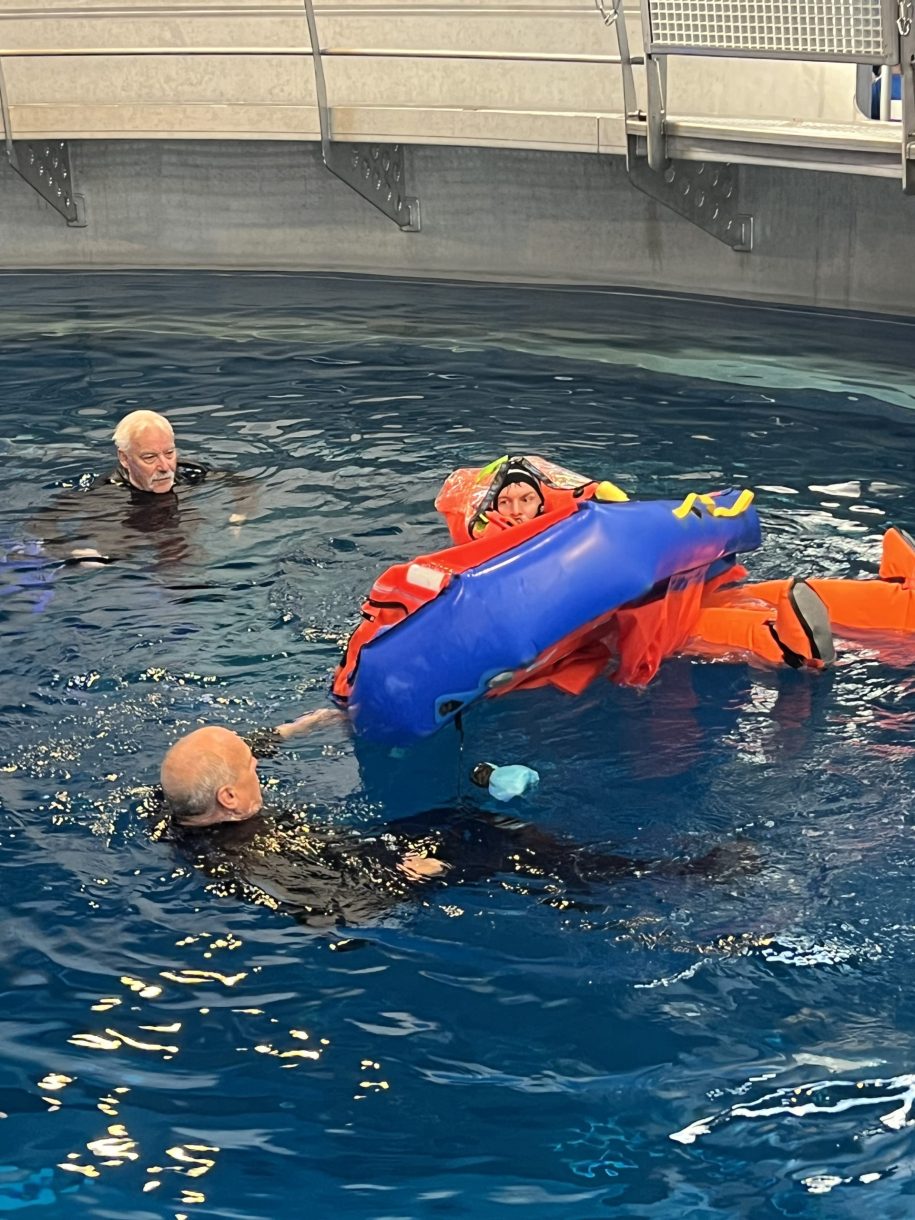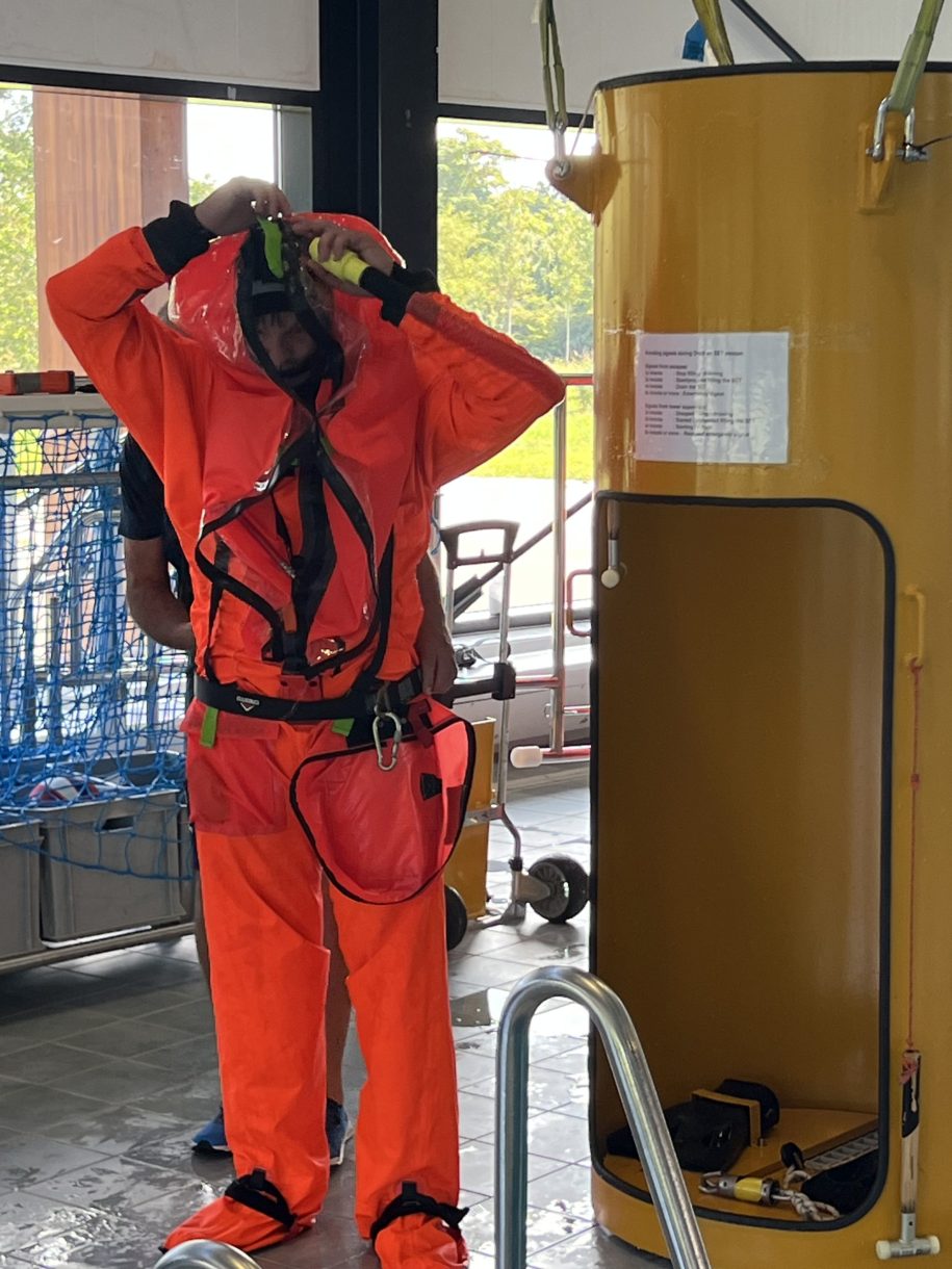 Daarna volgde een sessie in de Single Man Life Raft. Hier leerden de deelnemers hoe zij in een overlevingspak snel en effectief kunnen handelen in noodsituaties op zee. Dit oefenmoment leverde direct bruikbare ervaring op.