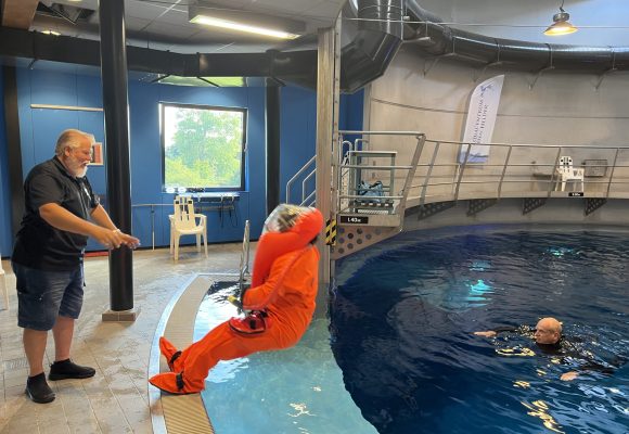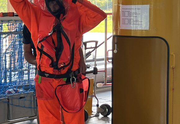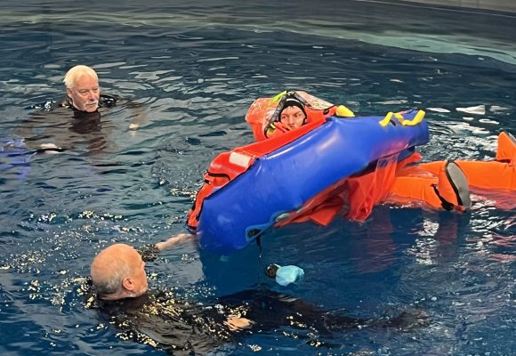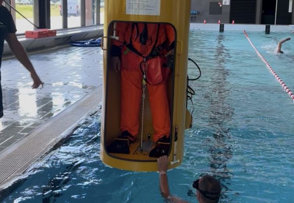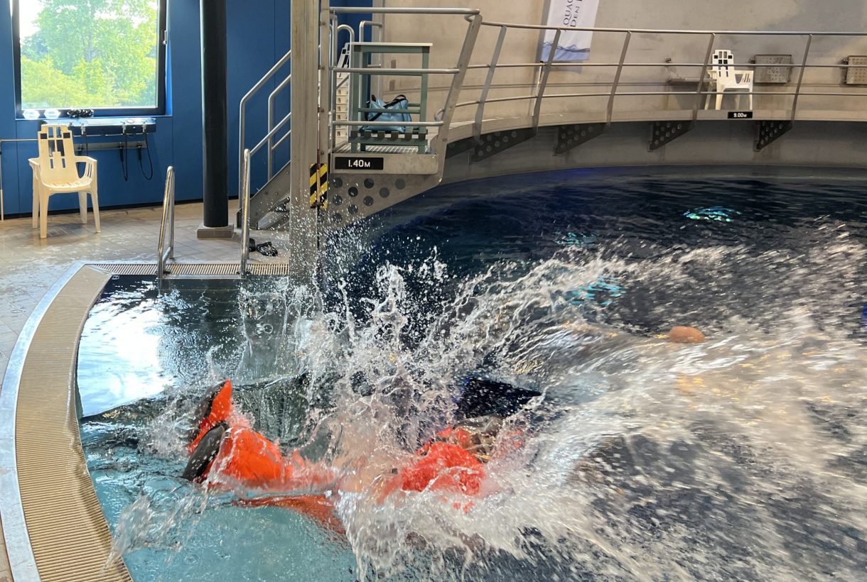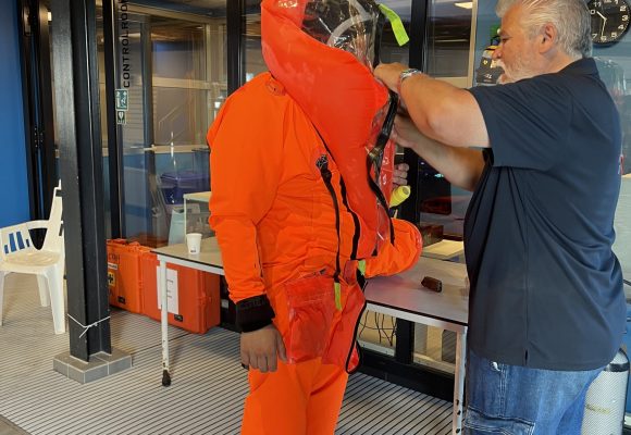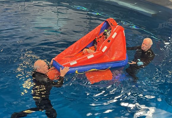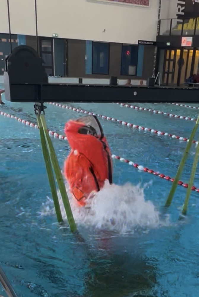 Daarna volgde een sessie in de Single Man Life Raft. Hier leerden de deelnemers hoe zij in een overlevingspak snel en effectief kunnen handelen in noodsituaties op zee. Dit oefenmoment leverde direct bruikbare ervaring op.