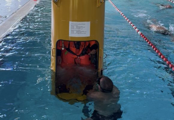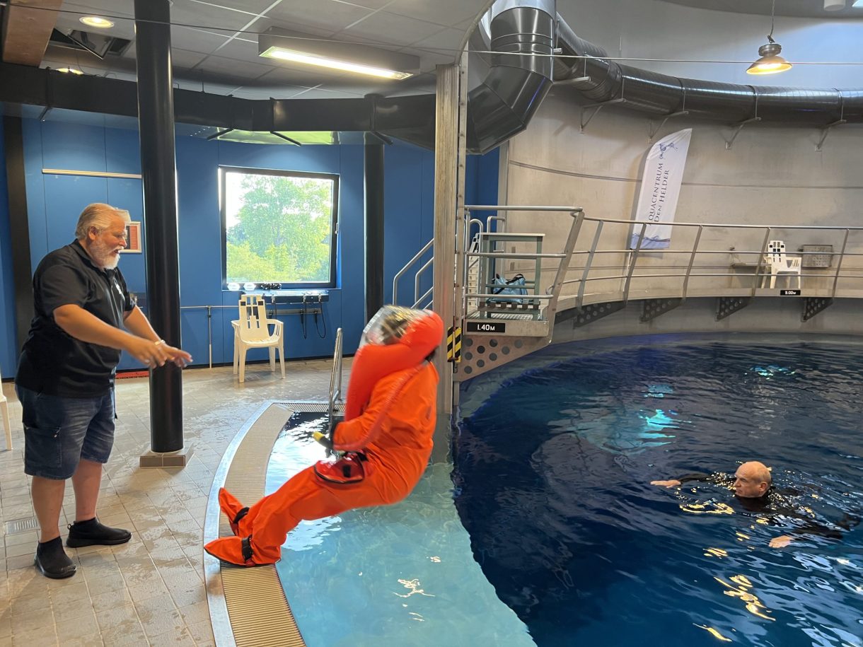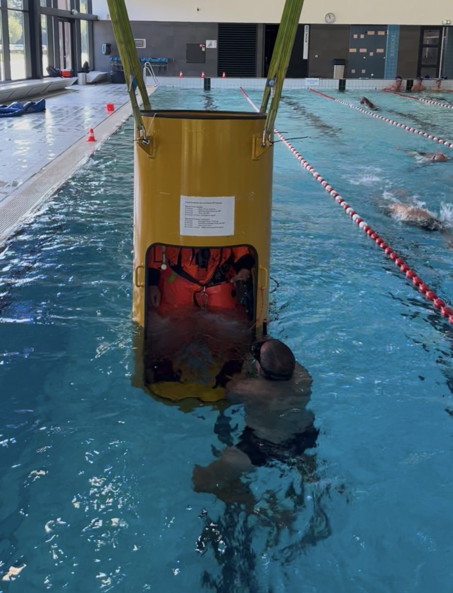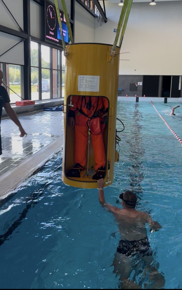 Na de lunch in de horecafaciliteit van het Aquacentrum stapten de deelnemers in de “Yellow Submarine”. Deze verplaatsbare buis simuleert de ontsnappingstoren van Triton12. Deelnemers konden hun techniek verfijnen in een veilige omgeving, voordat zij de officiële SET-module in de diepte betraden.